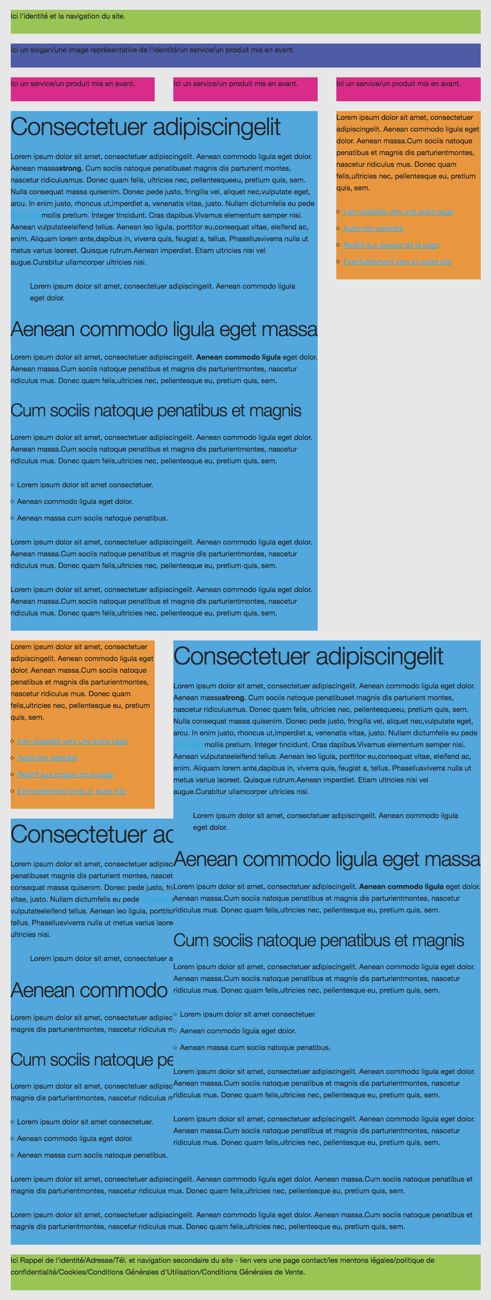 <aside>(soit : Contenu secondaire – peut contenir liens relatifs au site pointant vers d’autres pages du site ou autres sites – Images, Annonces publicitaires, vidéo imbriquée, Google Map imbriqué.) par le (faux texte) propos secondaire proposé dans le même document.