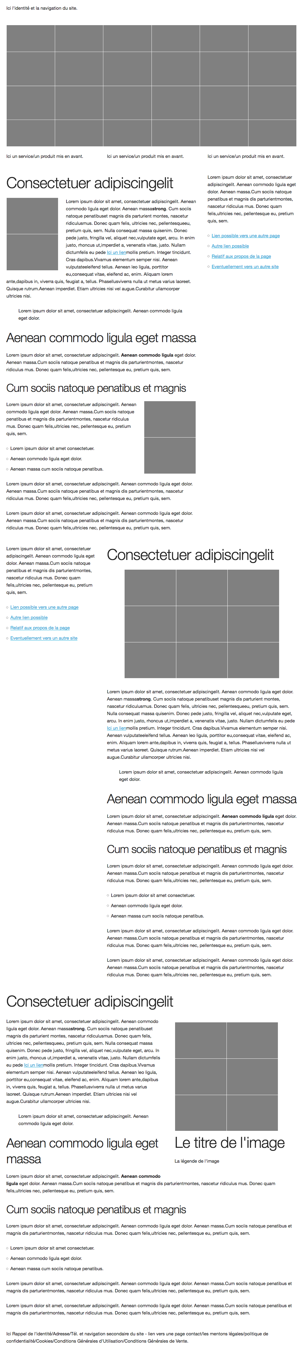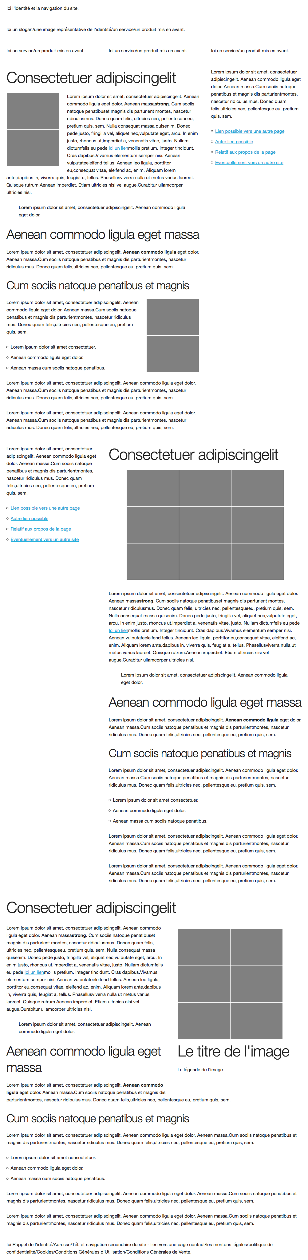 <p>Ici Rappel de l'identité/Adresse/Tél. et navigation secondaire du site - lien vers une page contact/les mentons légales/politique de confidentialité/Cookies/Conditions Générales d'Utilisation/Conditions Générales de Vente.</p>