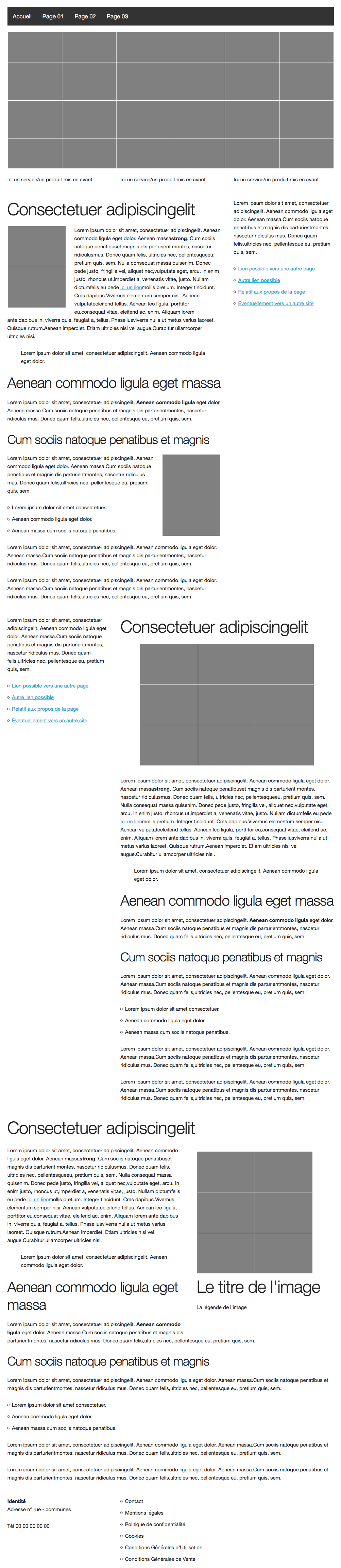 <!-- PIED --> <div class="row"> <footer class="four columns vert"> <p><b>Identité</b><br>Adresse n° rue - communes</p> <p>Tél 00 00 00 00 00</p> </footer> <footer class="eight columns vert"> <ul> <li>Contact</li> <li>Mentions légales</li> <li>Politique de confidentialité</li> <li>Cookies</li> <li>Conditions Générales d'Utilisation</li> <li>Conditions Générales de Vente</li> </ul> </footer> <!-- /PIED --> </div>