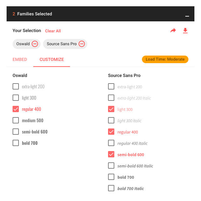 - L’onglet ouvert > Sélectionner Customize > Colonne Source Sans Pro > Ajouter light 300 + semi-bold 600 à regular 400