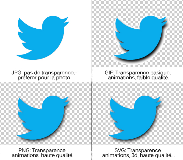 Il faut savoir que les formats d’images les plus courants sur le net sont les formats .png (Portable Network Graphics), .jpeg (Joint Photographic Experts Group) et .gif (Graphics Interchange Format) bien que d’autres formats existent et soit également présents sur le net.